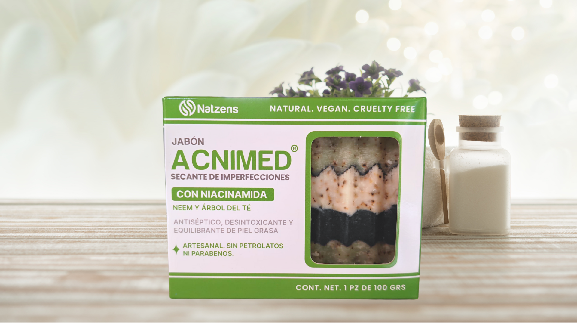 - Neem y Árbol de Té: Ingredientes naturales con potentes propiedades antisépticas y anti fúngicas, que actúan como el aliado definitivo contra las bacterias que causan el acné.