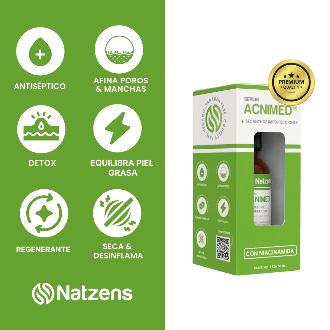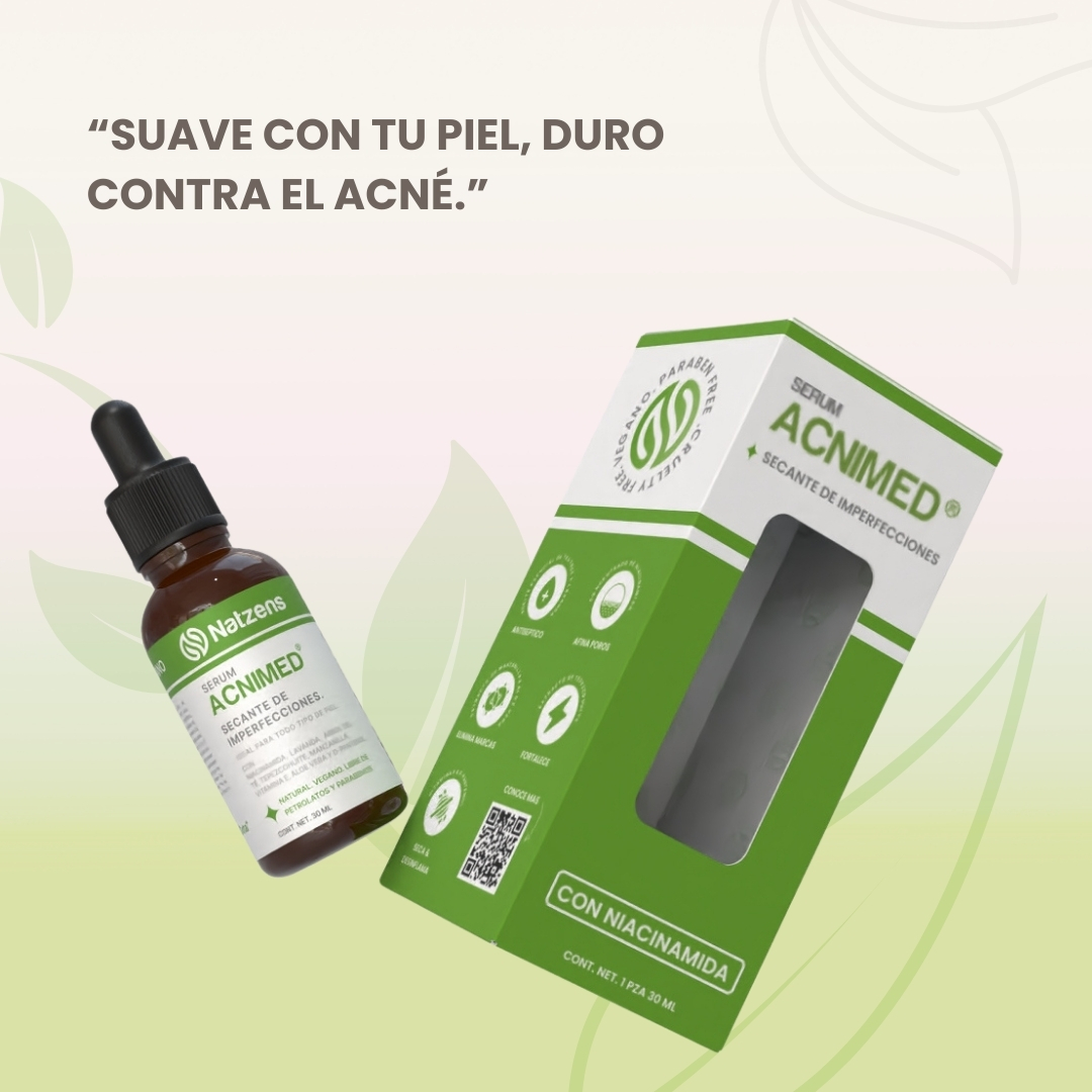Nuestro Serum Acnimed® natural está compuesto por ingredientes naturales y concentrados, diseñado para brindar una solución efectiva para el acné y las espinillas. Cada componente ha sido cuidadosamente seleccionado por su capacidad para combatir la piel inflamada y reducir el exceso de producción de sebo gracias a la Niacinamida.